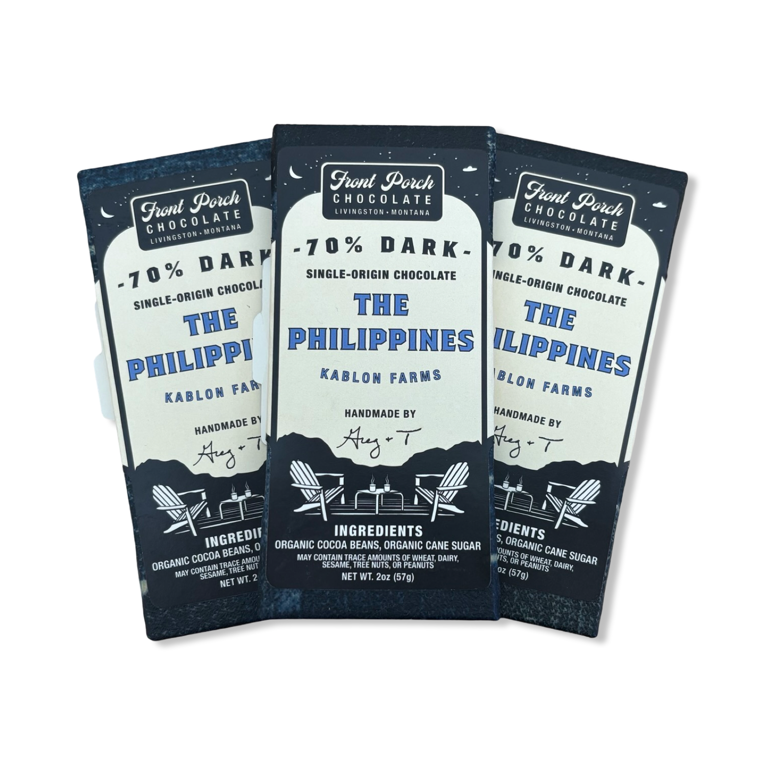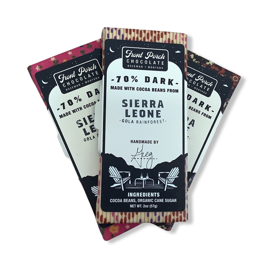 Indulge in high-quality chocolate with Front Porch Chocolate's 70% dark chocolate bars. Each bar is individually wrapped in a reusable beeswax wrap, perfect for those looking for more sustainable snacking options. Enjoy a rich flavor with every bite. Named after the regions the cocoa beans were grown and harvested.