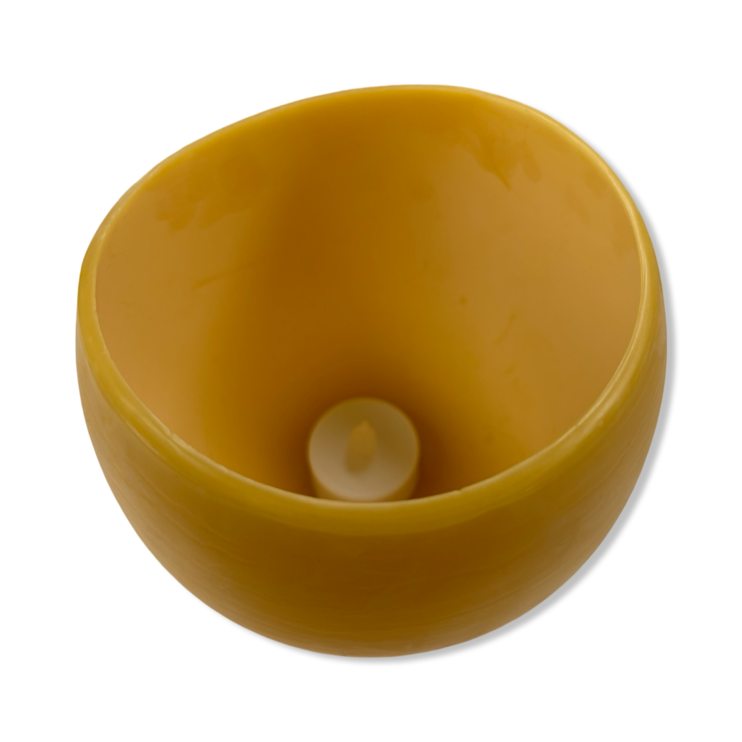 Hindu Hillbilly's delicate beeswax luminaries are molded from 100% beeswax. Each bowl is individually handcrafted and unique. Place rice in the bottom of the luminary and place a tea light on top and in the center. Larger lanterns will not melt, and the rims of smaller lanterns may fade to a stable point adding character to the bowl. These luminaries impart a sweet honey scent and tranquil glow.