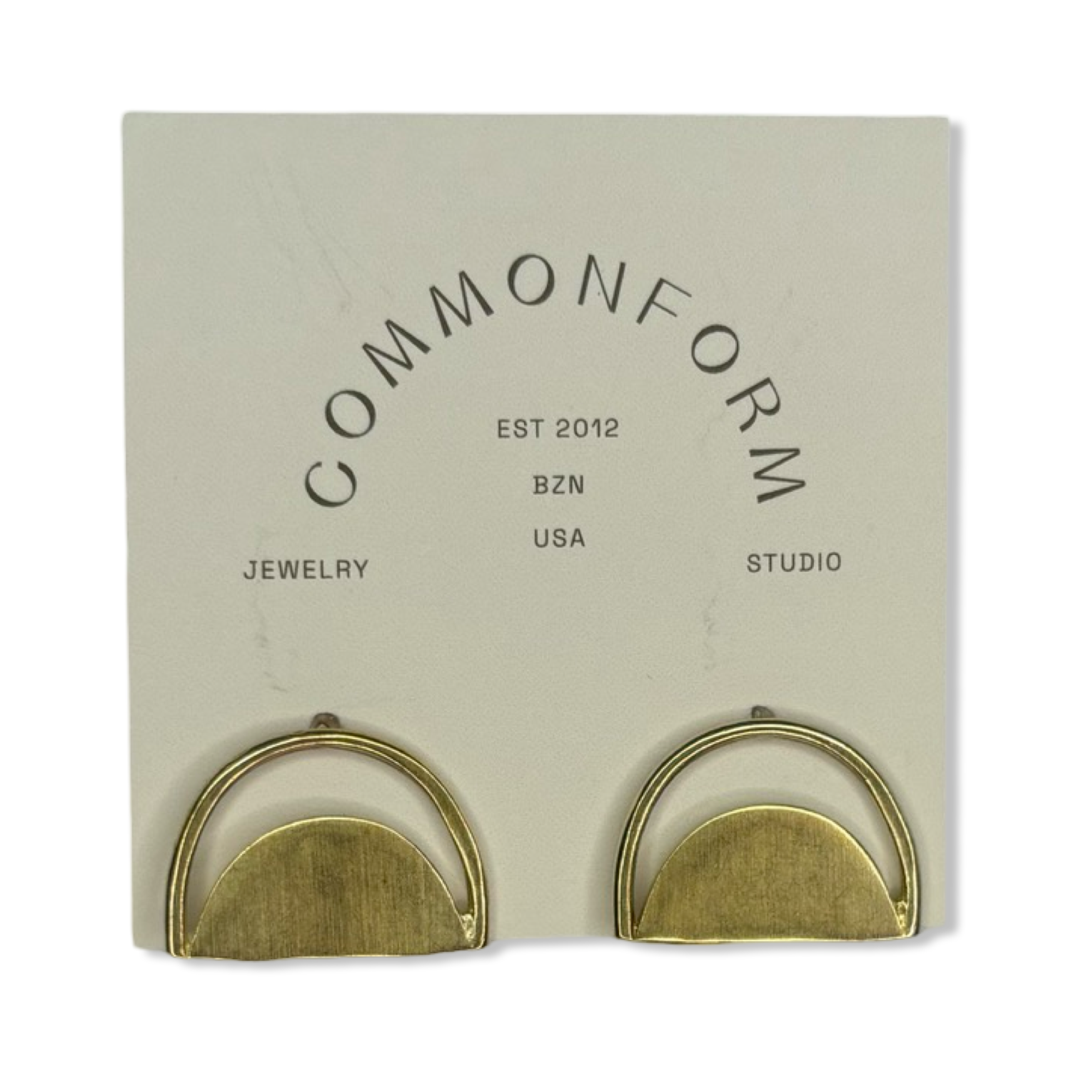 These Iris Studs from Commonform are crafted with casted solid brass pieces on sterling silver studs. Handmade in Montana, these unique half circle studs offer both durability and elegance for any occasion.