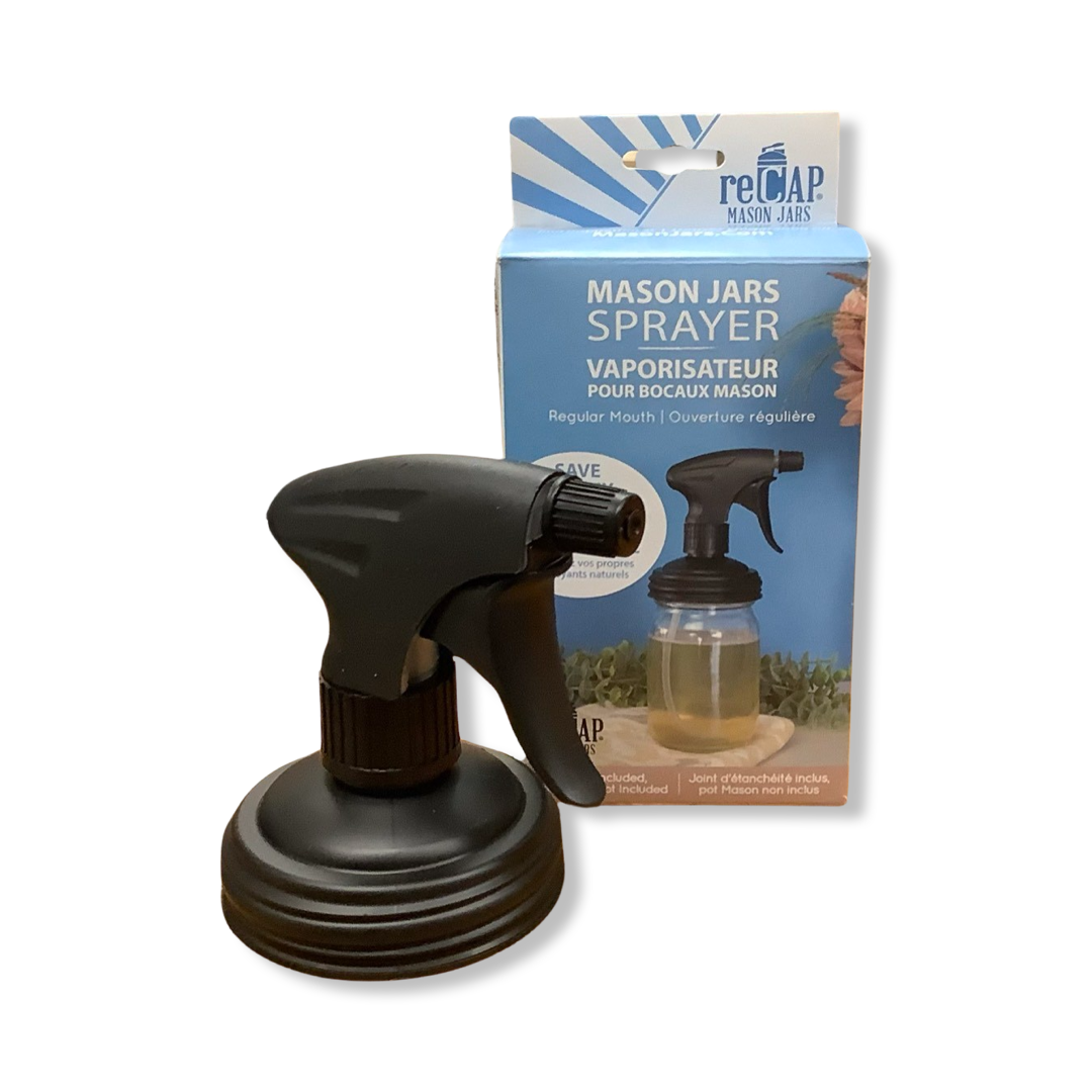 ReCAP's Sprayer Lid turns standard Mason Jars into multi-purpose containers, suitable for everyday use. The plastic trigger sprayer easily dispenses cleaners or other fine mists, with a wide head and ergonomic shape for comfortable operation. The sprayer adjusts from high output to mist, delivering excellent coverage, powerful performance, and a no-leak design. Guaranteed to fit any standard regular-mouth Mason jar, with dimensions of 3.2"L x 1.9"W x 5.5"H.