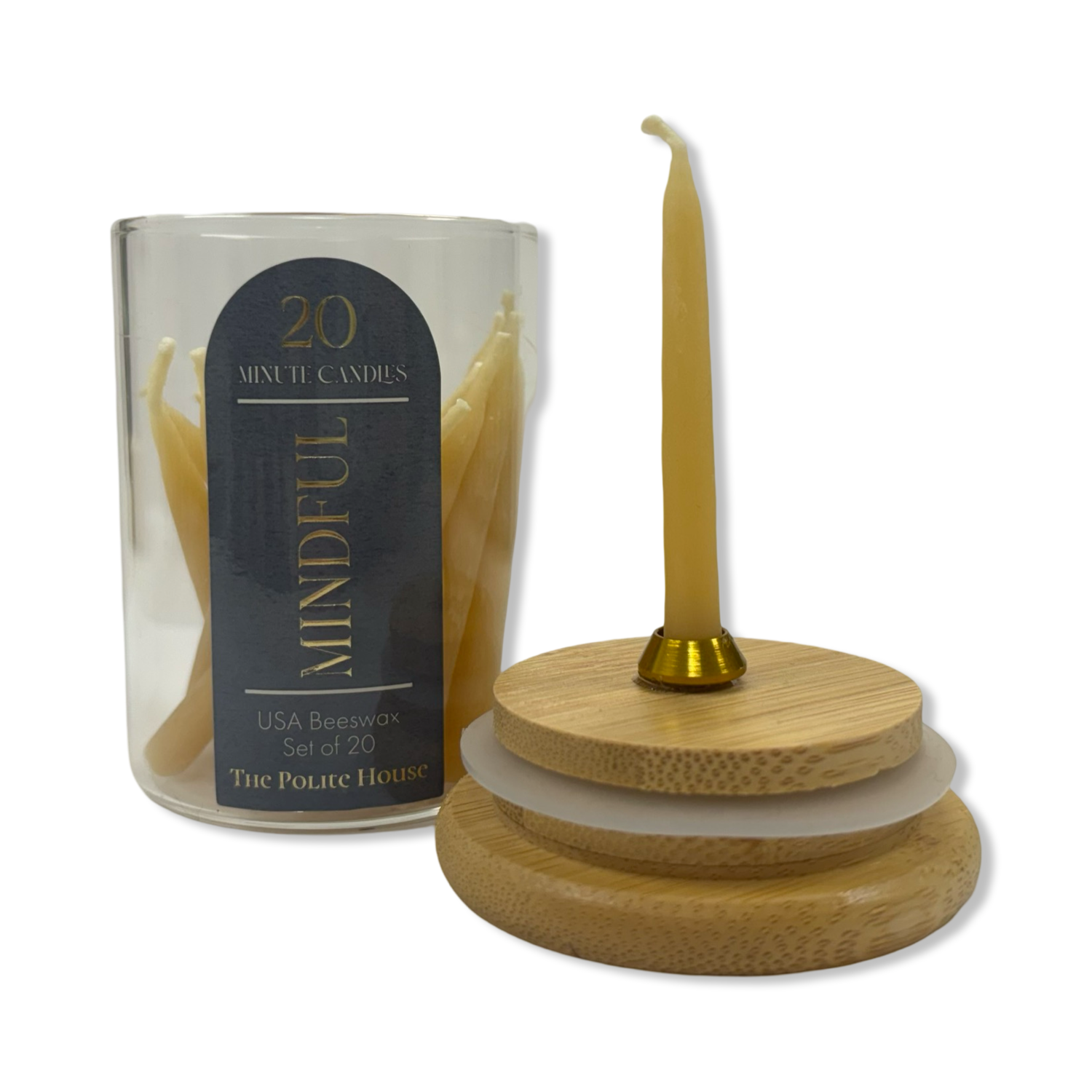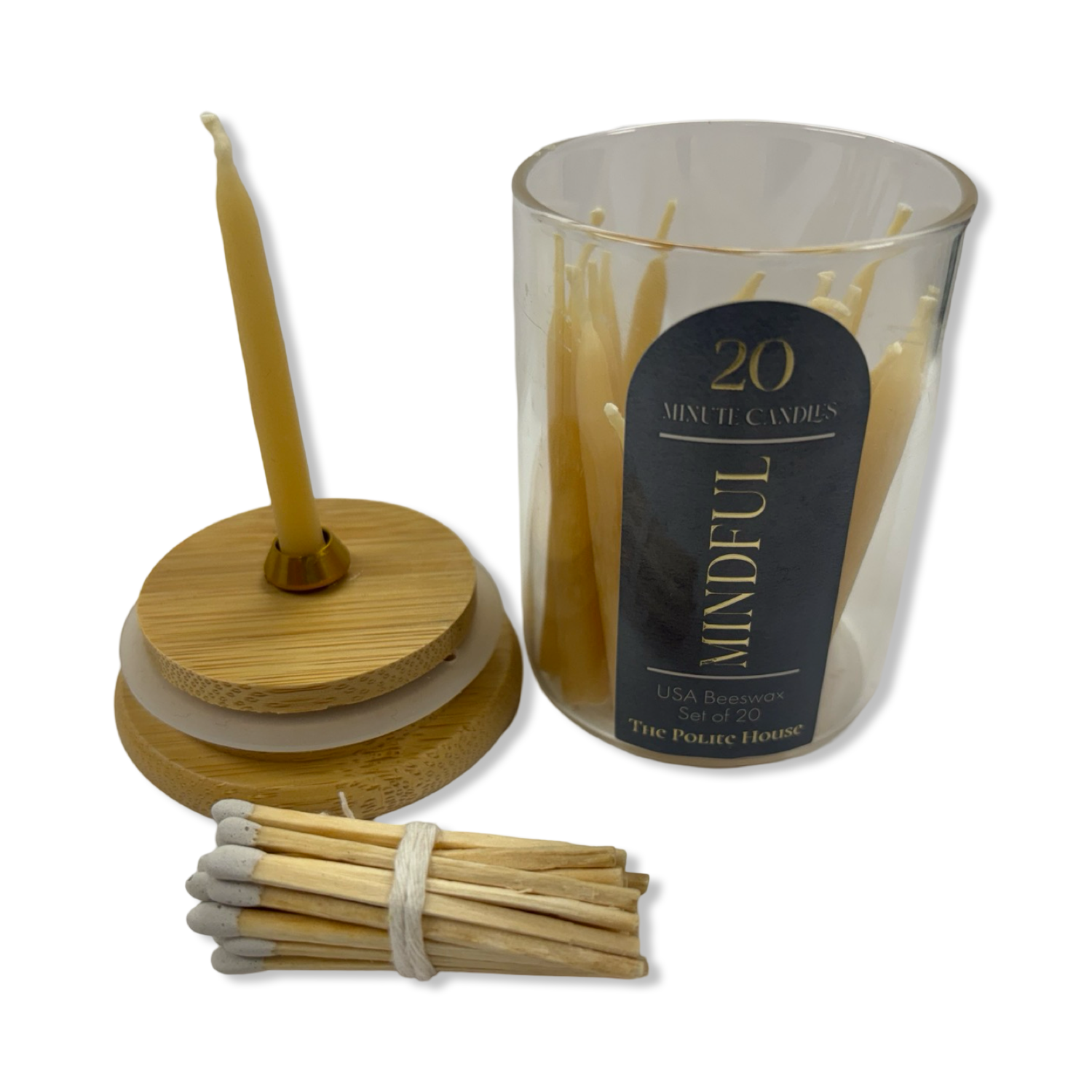 Set of 20 Mini Beeswax Candles Each Burning for 20 Minutes With Matches and Holder. For Self-Care and Mindfulness. Burning Instructions: Remove the safety wax cap from the post, inside the lid. Place taper on the post. Be sure the post goes through the center of the candle & is standing upright. Only burn on a level, fire-resistant surface. Stop Burning when 1/4" of wax remains. The candle will burn for approximately 20 minutes.