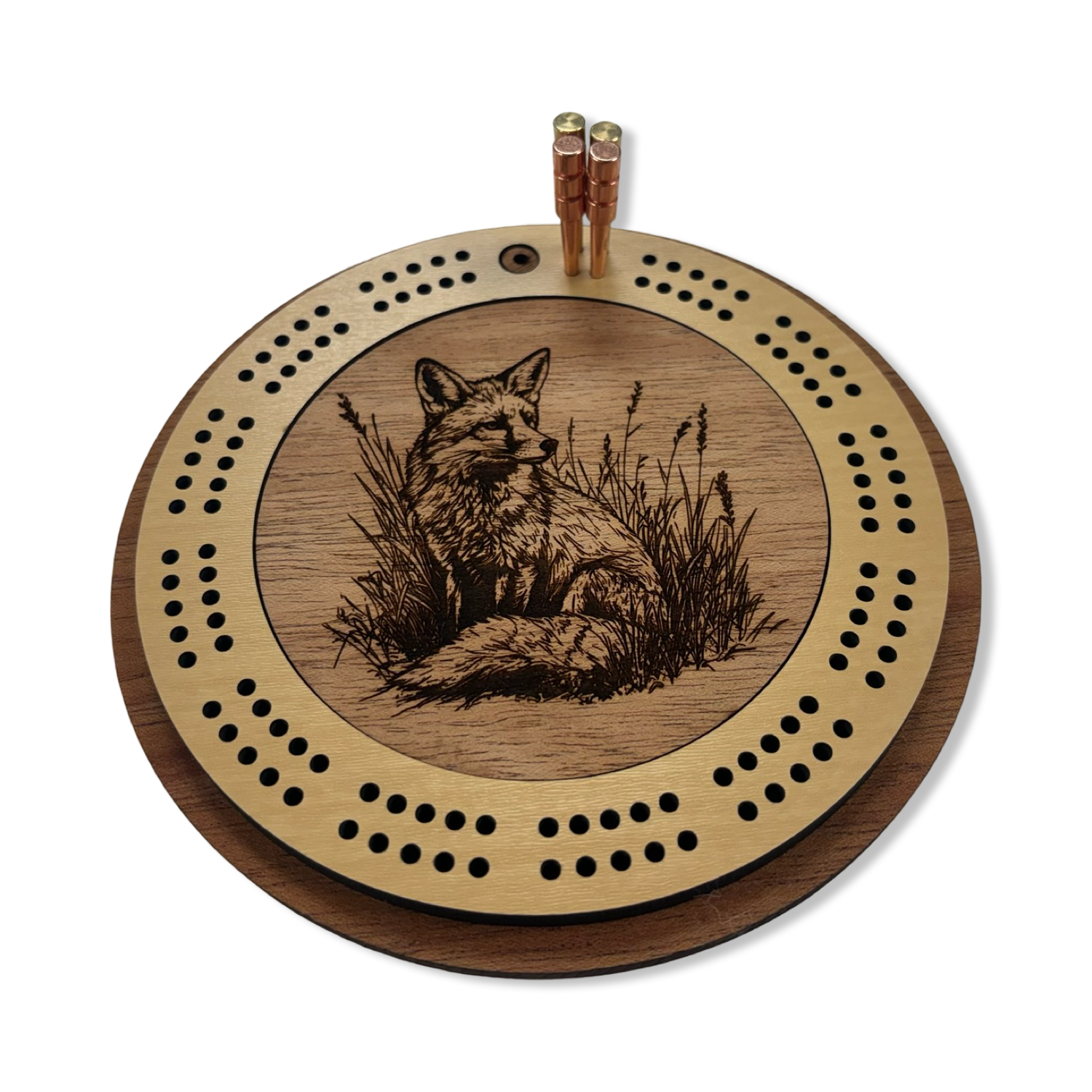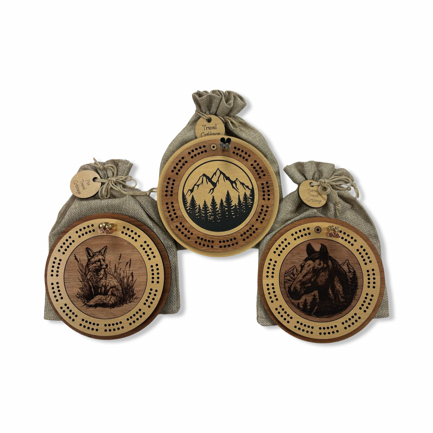 This high-quality Wooden Engraved Cribbage Board from Rising Joy Creations will take your game to a whole new level. Crafted with attention to detail, it's adorned with a stunning mountain scene, fox, or horse in a circle design. Great for travel and taking out with you on a nice picnic or camping trip!