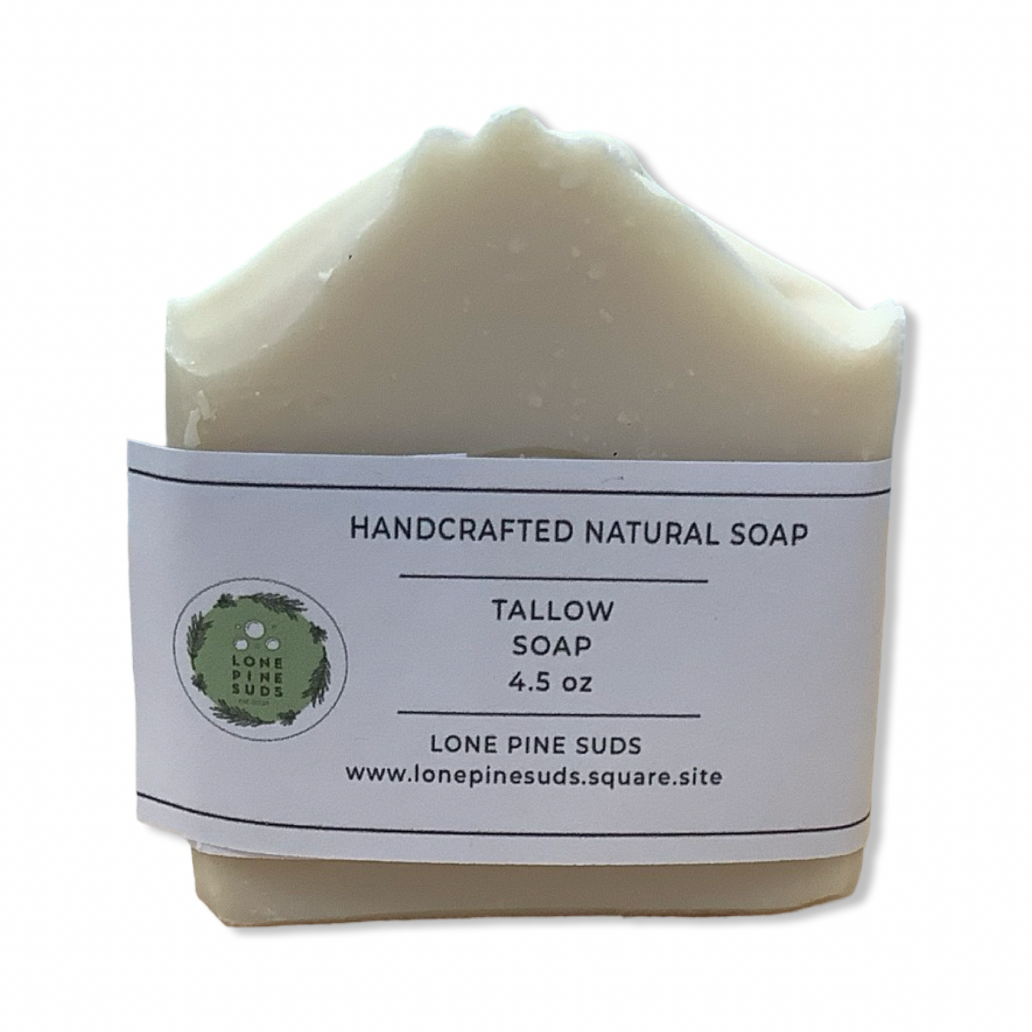 Tallow: Saponified oils of (hand rendered grass fed tallow, organic coconut, cocoa butter, grapeseed, castor) sodium hydroxide, distilled water, sodium chloride, organic castor sugar, kaolin clay, essential oils of cedarwood, orange, and lavender.