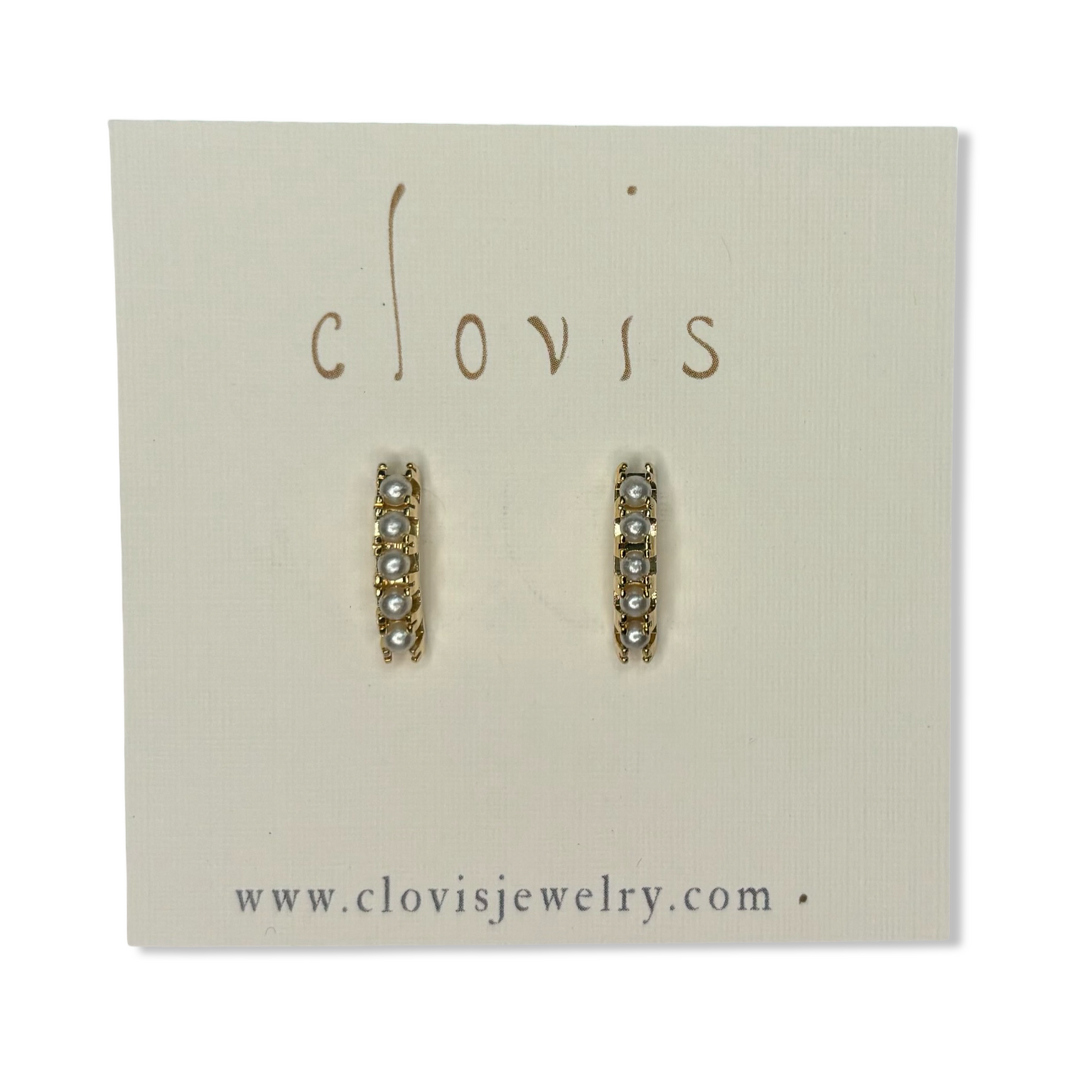 Introducing the Pearl Arch Studs from Clovis Jewelry. These handmade earrings feature a unique vertical arched design adorned with 5 delicate pearls. Elevate your style and add a touch of elegance to any outfit with these stunning and one-of-a-kind pieces.