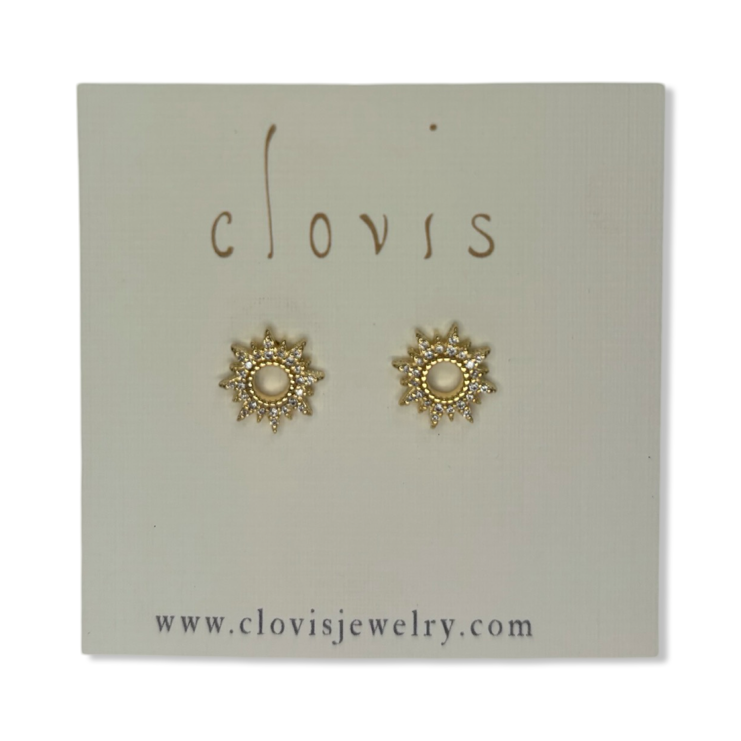 Shine bright with these handmade Sunburst Gem Studs from Clovis Jewelry! Crafted in the shape of a radiant sun, these studs feature sparkling gems that add a touch of glamour to any outfit. Perfect for bringing a little sunshine to your day, and making a statement with your style.