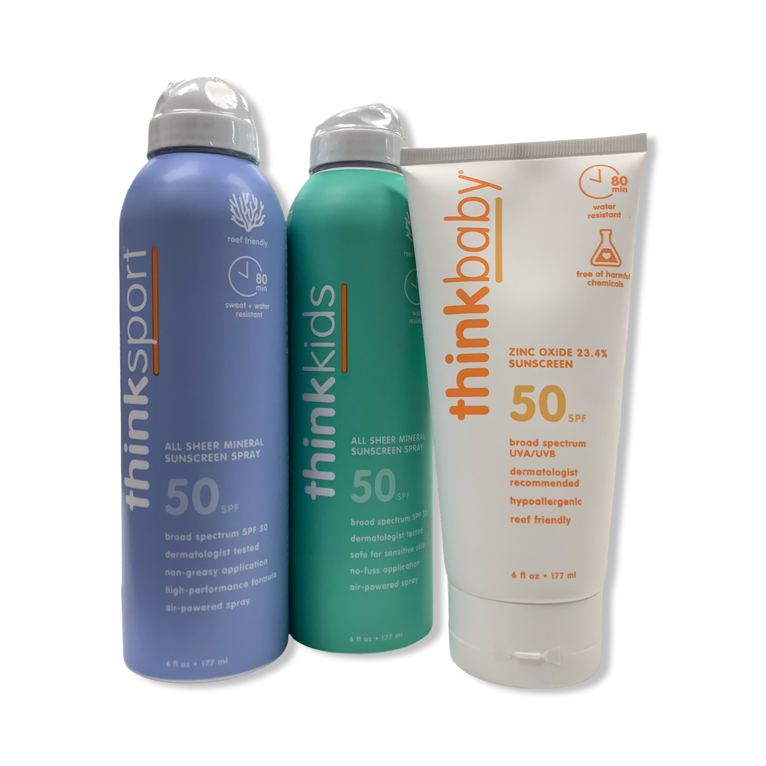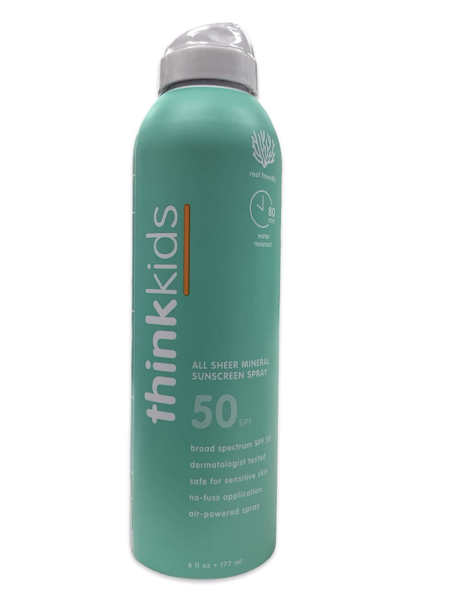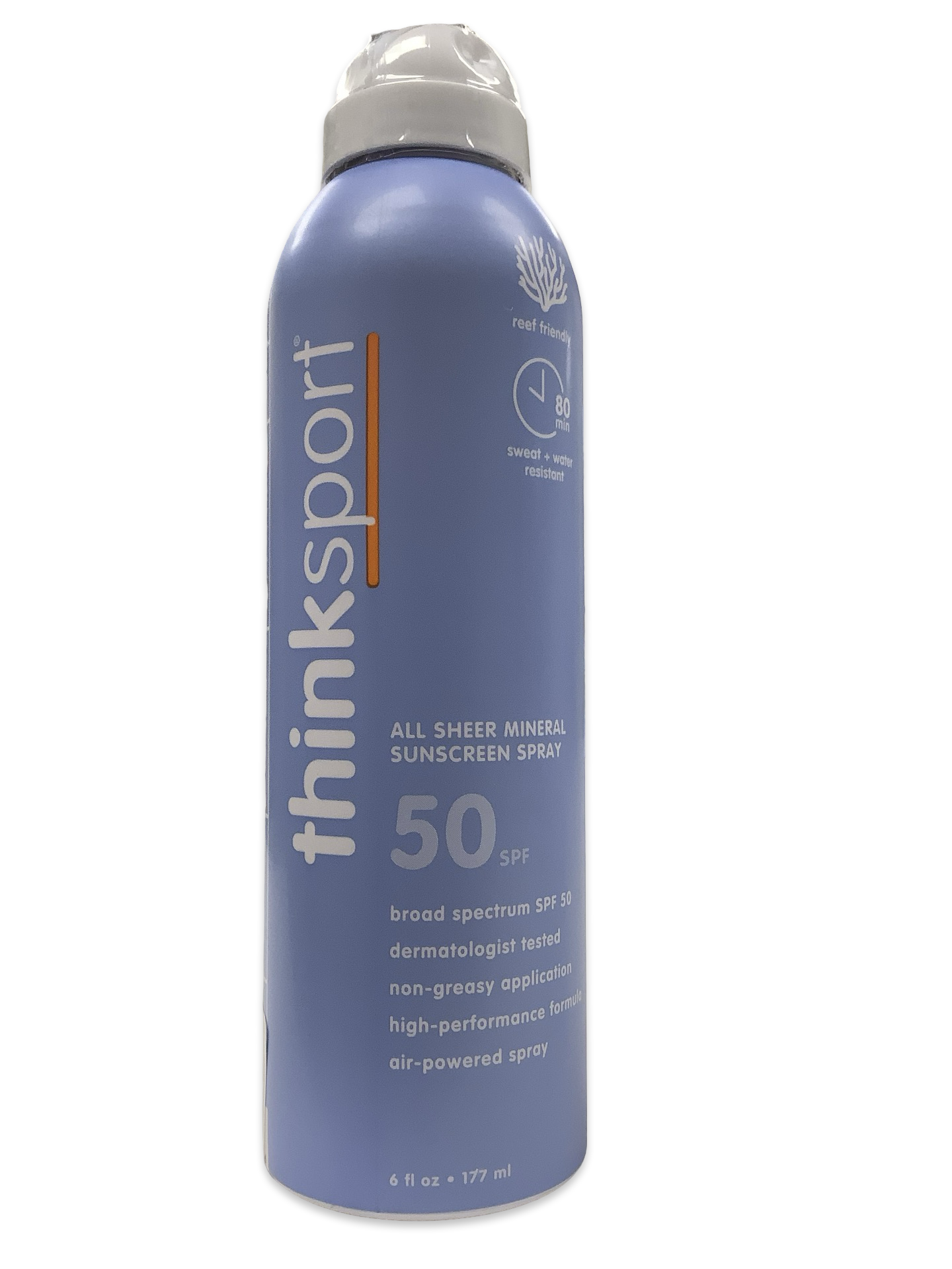 Sport: Designed for an active lifestyle, our high performance, dermatologist tested sunscreen spray is formulated with reef safe, non-nano Zinc Oxide and Titanium Dioxide for up to 80 minutes of sweat and water-resistant protection. Works to create a physical barrier from harmful UVA/UVB sun rays. Benefits of ThinkSport Mineral Sunscreen Spray: - Provides healthy, broad-spectrum UVA/UVB protection - No PABA, parabens, phthalates, oxybenzone, avobenzone, petroleum, dioxane, gluten or dairy. No animal by-products or testing. - Does not contain any chemicals known to be harmful to coral reefs. - Non-greasy application - Non-sticky formula - Air-powered spray - Broad spectrum UVA/UVB