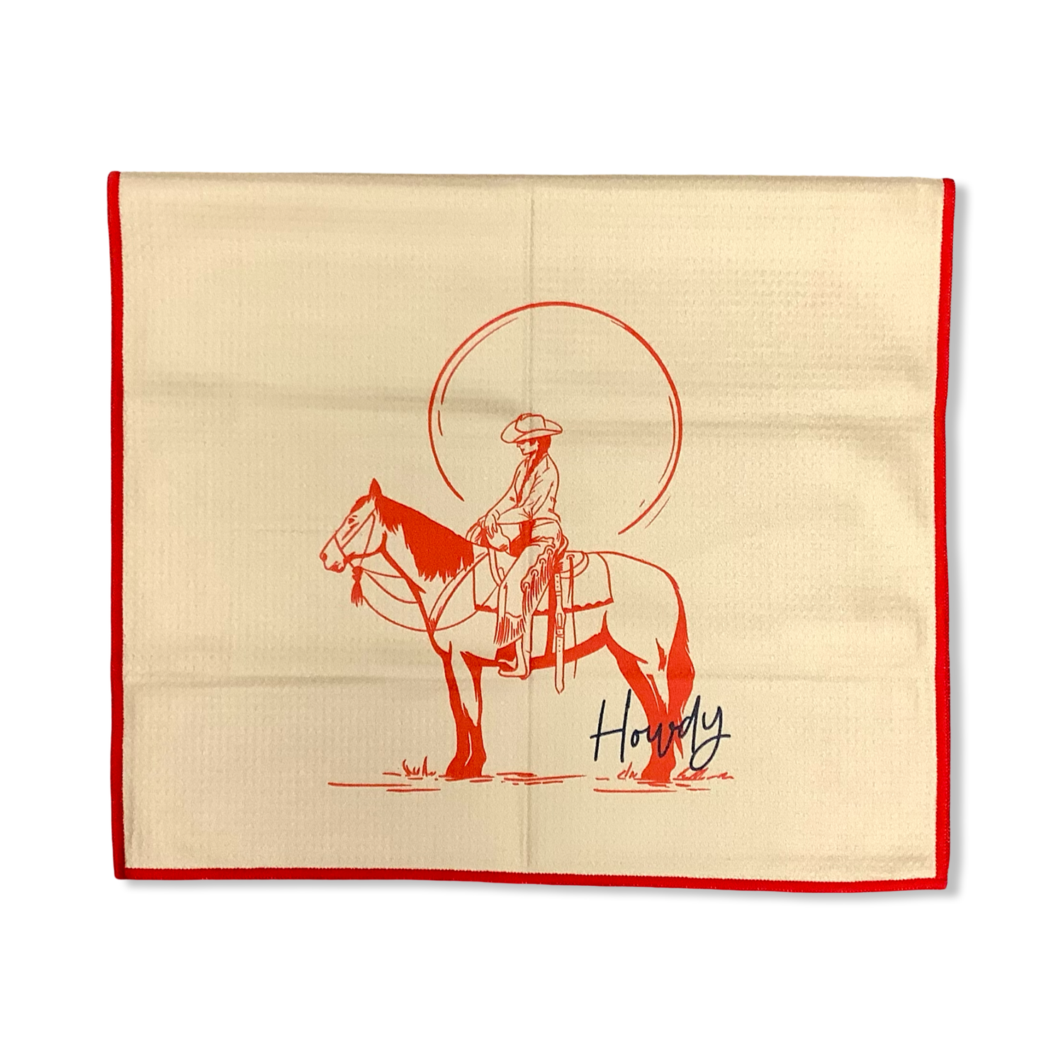This is an 18"x30" microfiber waffle tea towel with a playful and colorful pattern. The microfiber waffle weave provides excellent absorbency and quick-drying capabilities, making it a practical yet charming addition to any kitchen.