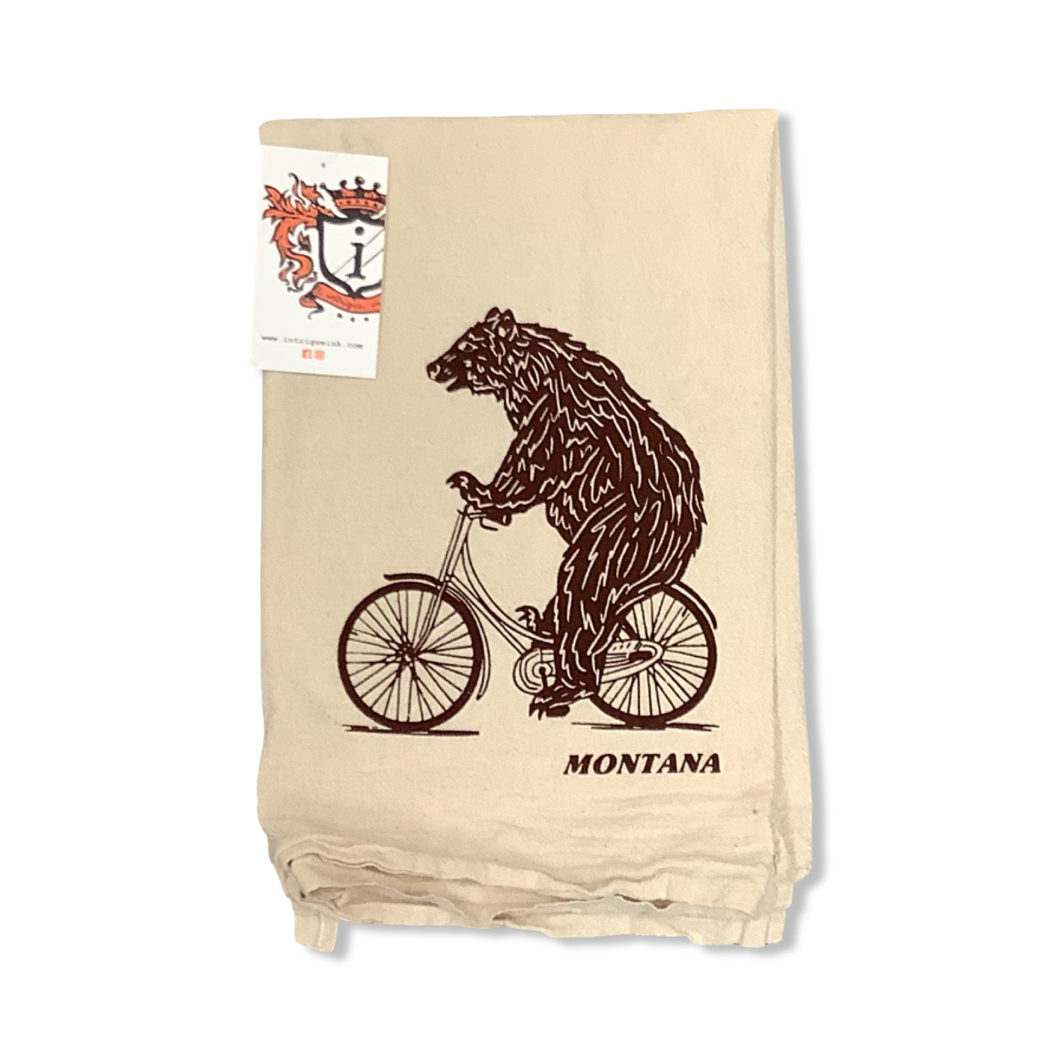 A massive bear, with fur ruffling in the wind, pedals down the trail on a bike far too small for its bulky frame, its paws gripping the handlebars with surprising dexterity.
