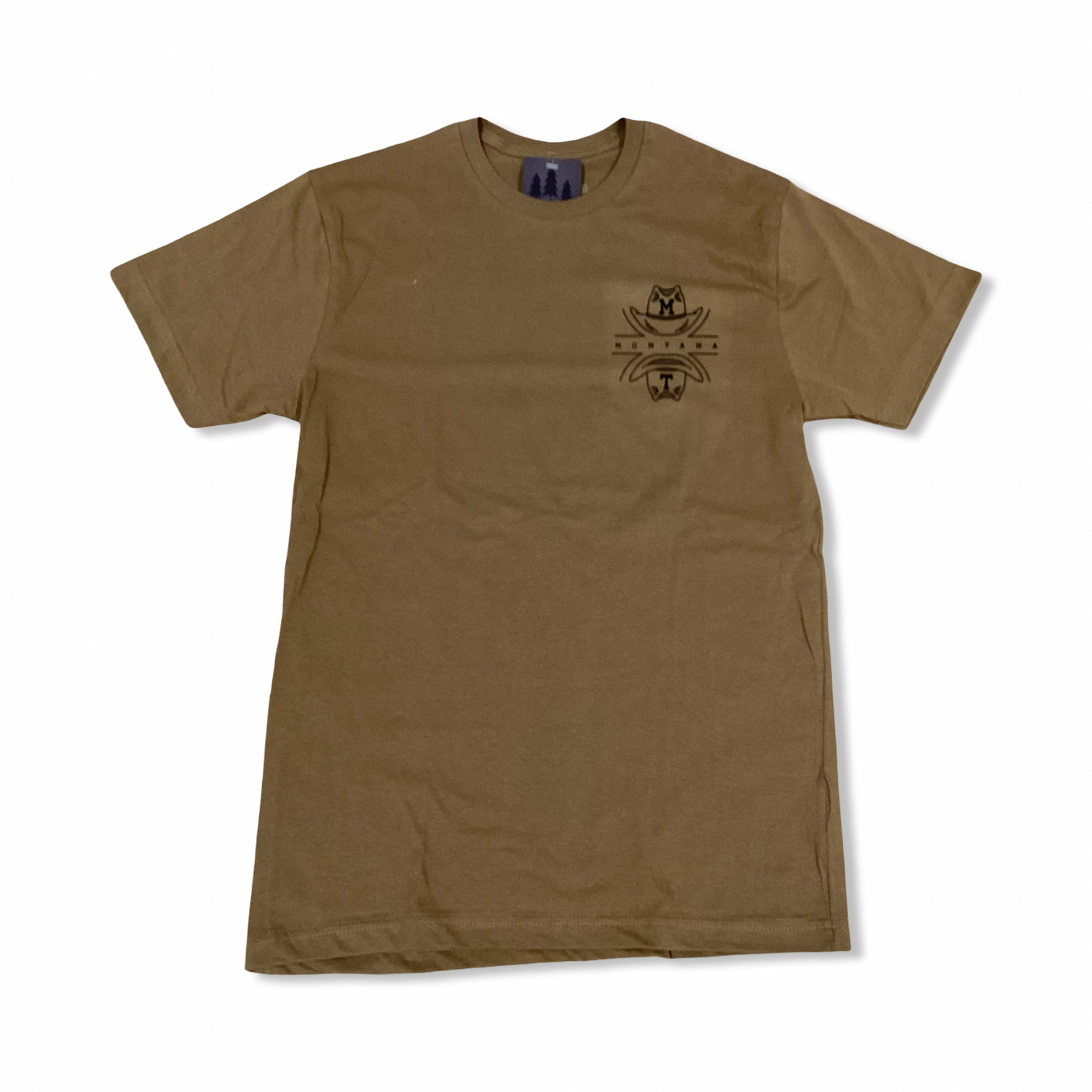 Make a statement in this camel-colored tee with a unique Montana-inspired design featuring a pair of classic cowboy hats.